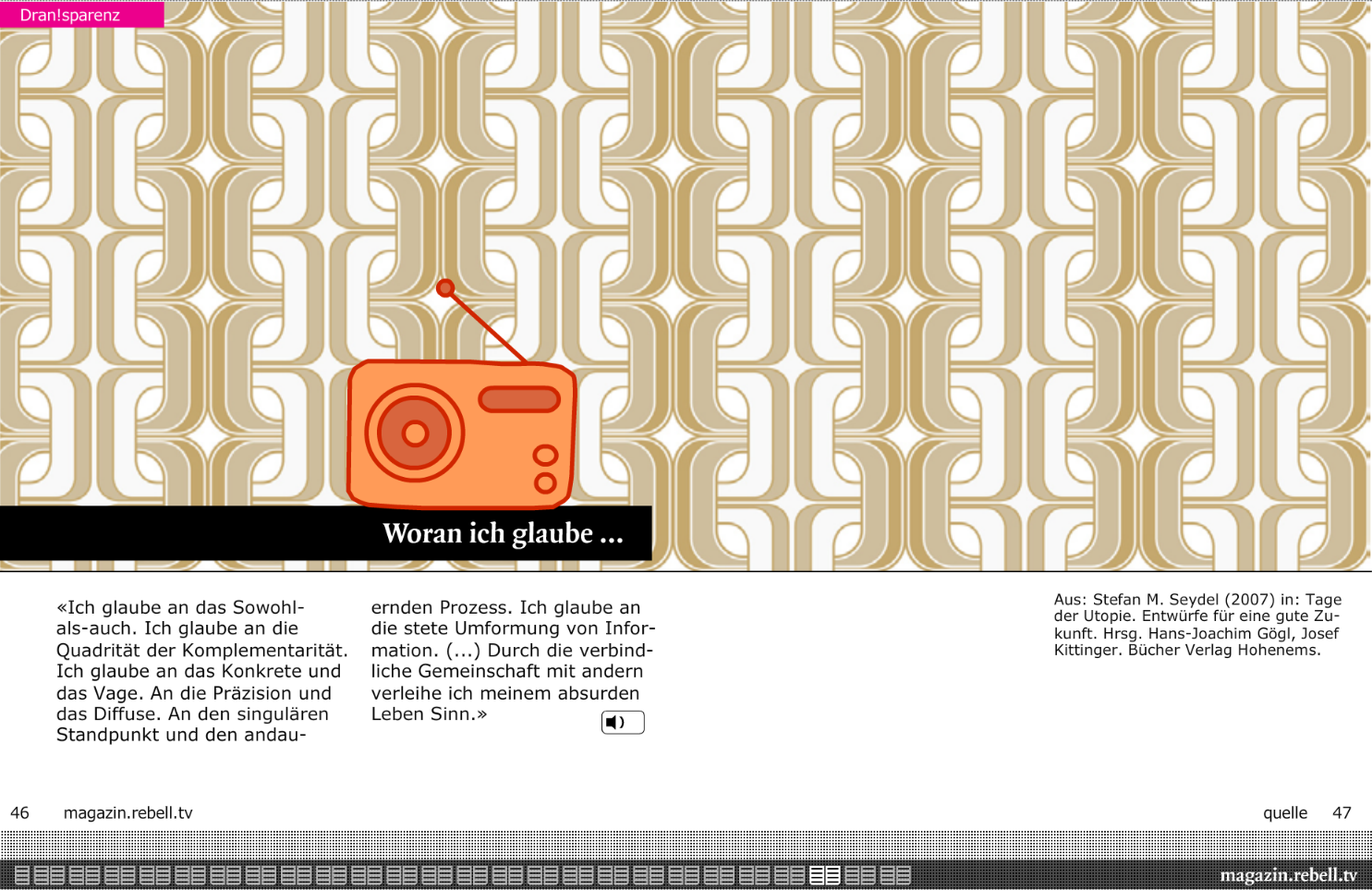 das glaubensbekenntnis haben wir dann später verschiedene male wieder eingebaut. eine verkürzte fassung in magazin.rebell.tv (flash!). gelesen von philipp bürkler. (wir jagten in jener zeit grad NZZkompakt als podcast auf platz #1 der iTunes downloads in german speaking part of europe ;-) und einmal habe ich selbst gelesen. in einer einleitung zu meinem vortrag an einem kongress der bibliothekswissenschafter in potsdam: