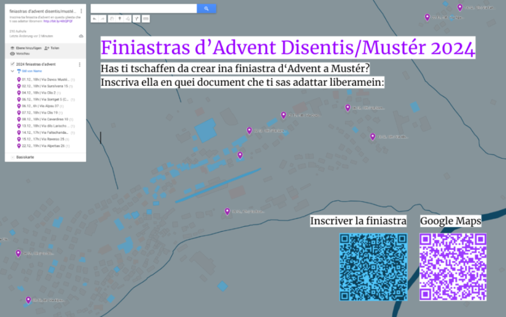 “Far in tec per ils auters ei pli dulsch che retscheiver in tec per sasez.“ Finiastras d’Advent Disentis/Mustér 2024 Schassap, ei setractass dil fatg che nossa atgna legria da crear ina finiastra d’Advent fagessi vegnir endament ad auters lur atgna legria da haver gestalt finiastras d’Advent e da haver giu plascher da quellas dils auters… lu survegniss quella glista adattabla ed il transfer sin Google Maps ina funcziun tut nova. | TeilGEBEN ist seeliger als TeilNEHMEN Adventsfenster in Disentis/Mustér 2024 … angenommen, es ginge darum, dass unsere eigene freude ein adventsfenster zu gestalten, andere daran erinnert, dass sie ja eigentlich auch immer freude daran hatten, advenstfenster zu gestalten und sich an von anderen gestalteten adventsfenster zu freuen… dann bekommt ja diese frei bearbeitbare liste und die übertragung auf google maps eine völlig andere funktion… |