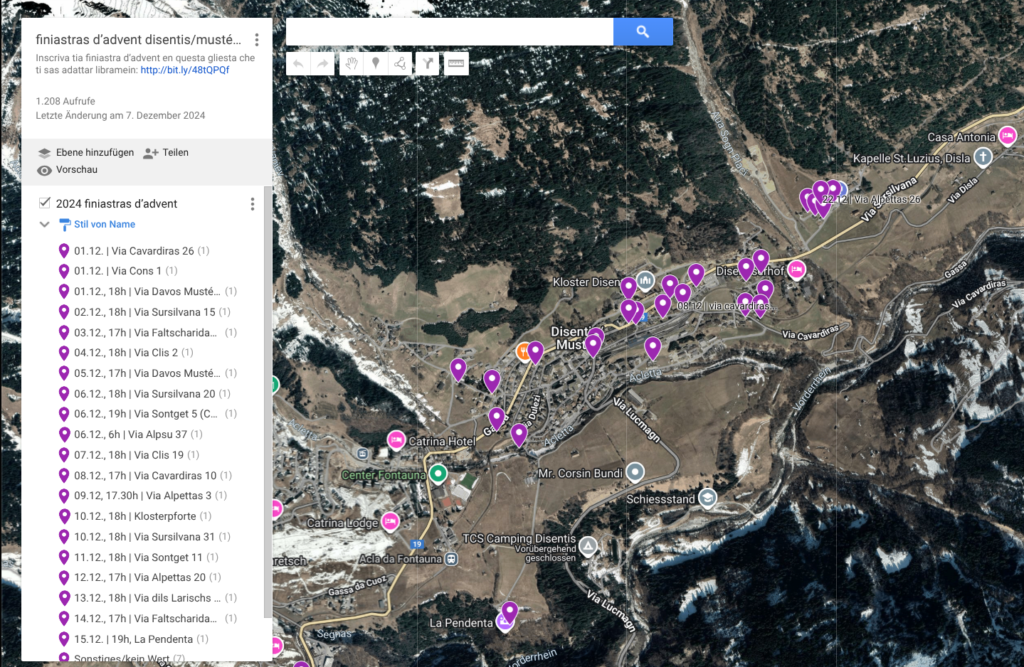 | “Far in tec per ils auters ei pli dulsch che retscheiver in tec per sasez.“ Finiastras d’Advent Disentis/Mustér 2024 Schassap, ei setractass dil fatg che nossa atgna legria da crear ina finiastra d’Advent fagessi vegnir endament ad auters lur atgna legria da haver gestalt finiastras d’Advent e da haver giu plascher da quellas dils auters… lu survegniss quella glista adattabla ed il transfer sin Google Maps ina funcziun tut nova. | TeilGEBEN ist seeliger als TeilNEHMEN Adventsfenster in Disentis/Mustér 2024 … angenommen, es ginge darum, dass unsere eigene freude ein adventsfenster zu gestalten, andere daran erinnert, dass sie ja eigentlich auch immer freude daran hatten, advenstfenster zu gestalten und sich an von anderen gestalteten adventsfenster zu freuen… dann bekommt ja diese frei bearbeitbare liste und die übertragung auf google maps eine völlig andere funktion… |