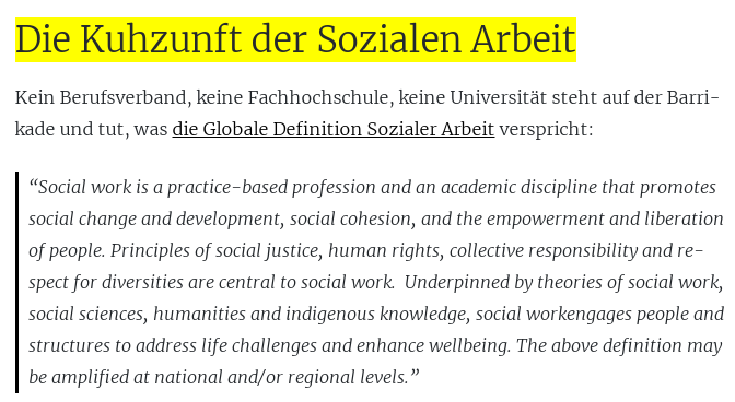 Kein Berufsverband, keine Fachhochschule, keine Universität steht auf der Barrikade und tut, was die Globale Definition Sozialer Arbeit verspricht: