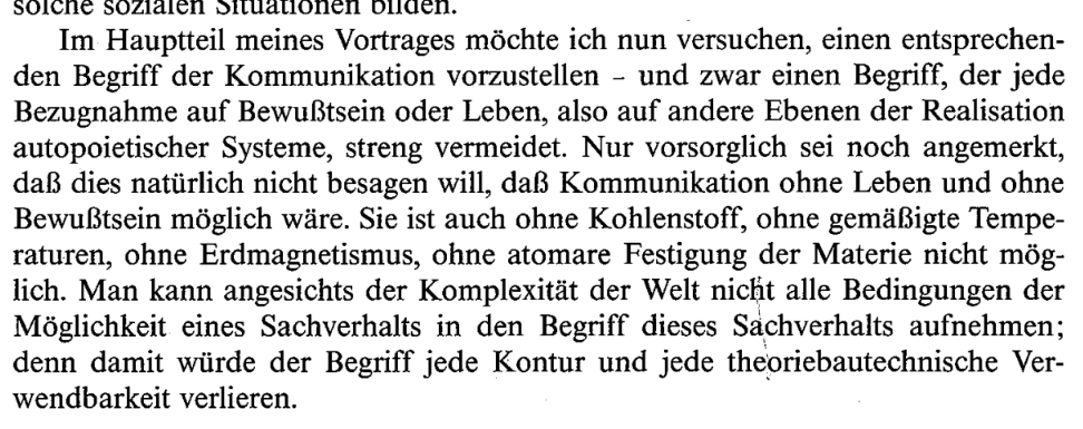 Kommunikation ist für das Soziale, das, was “Leben” für das Biologische und “Bewusstsein” für das Psychische ist. (Und ??? für Cyber.)