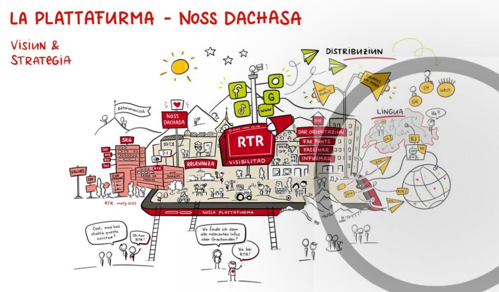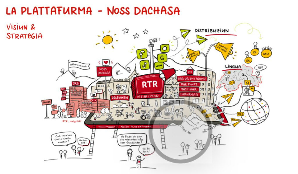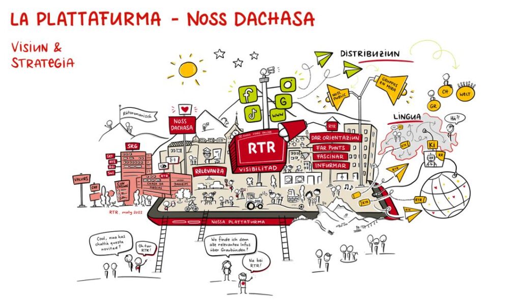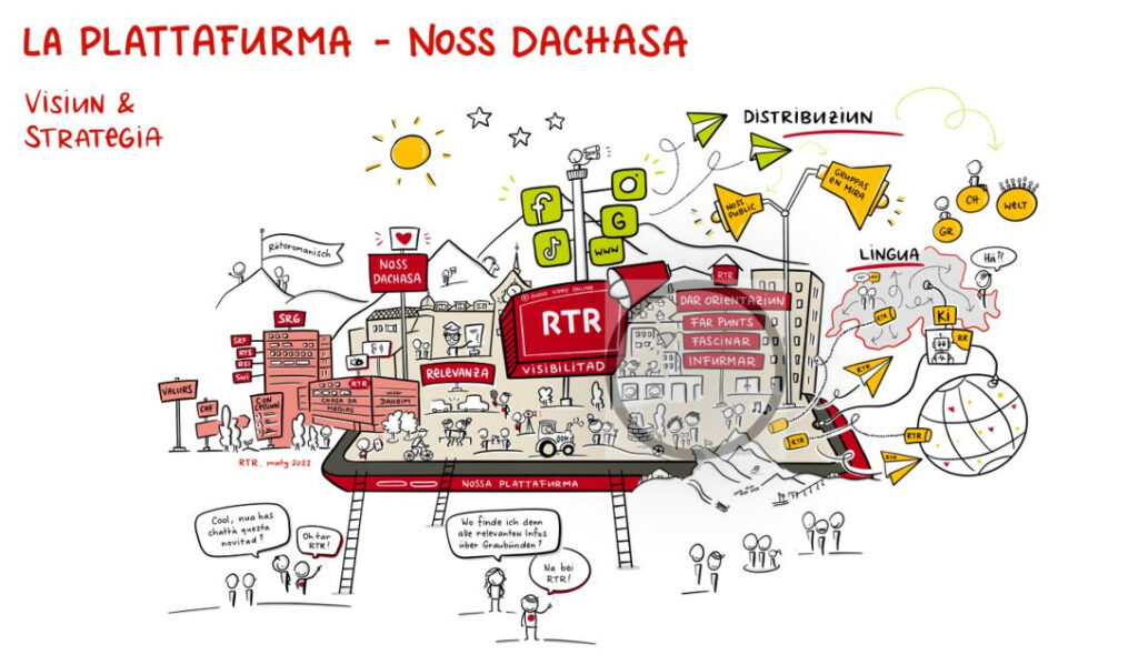 Die Kritik der “Bündelung” von Information “durch das Haus der SRG”, wäre auch im Bild von RTR zu entdecken, wenn auch hier viel verspielter und mit immerhin expliziter Darstellung, dass im Bewusstsein gehalten wird, dass es “hinter den sieben Bergen” schon auch noch ganz anderes gibt. (so?)