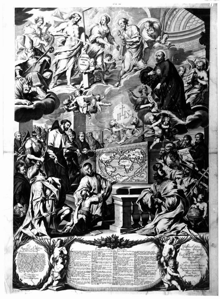 Beispiel für ein Thesenblatt: Die Weltmission der Gesellschaft Jesu, 17. Jahrhundert. Kupferstich von zwei Platten, 91,9 × 64,4 cm; Staats- und Stadtbibliothek Augsburg (Johann Christoph Storer (1620–1671, Zeichner), Bartholomäus Kilian d.J.(1630–1696, Stecher)) | Die Darstellung der Welt als Herz und “Die Geschichte der Kindheit”: #Engelspause