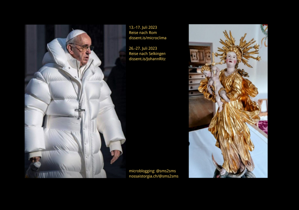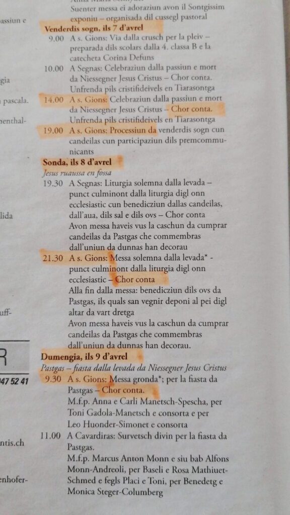 Eine rätoro­man­is­che Sage aus der Sur­sel­va. Sagt Anton Derungs 1938Sagt Peter Egloff 1982Zweis­prachig wun­der­voll neu aufgelegt 2015 im Lim­mat Ver­lag. Mit Bildern von Steivan Liun Könz. Mit strengem Copy­right belegt: «Alle Rechte vor­be­hal­ten, ins­beson­dere das des öffentlichen Vor­trags, der Rund­funksendun­gen und der Fernse­hausstrahlung, der foto­mech­anis­chen Wieder­gabe, auch einzel­ner Teile.» – Gott steh uns bei.