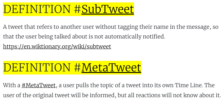 With a #MetaTweet, a user pulls the topic of a tweet into its own Time Line. The user of the original tweet will be informed, but all reactions will not know about it.