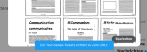 Seit Ende März 2023 habe ich einen blauen Hacken an meinem Twitter-Zettelkasten-Account @sms2sms und damit die Möglichkeit 4000 Zeichen abzusetzen. Ich war bekennender Fan der 140-Zeichen von Twitter. Abernu: Auf diese zwei Tweets habe ich versucht, die 4000 Zeichen auszuschöpfen und durfte dann aber den Tweet nicht absetzen, weil ich zu viele Hyperlinks verarbeitet habe. … “unikat mit wenig echo” @alekshirsch weiterlesen