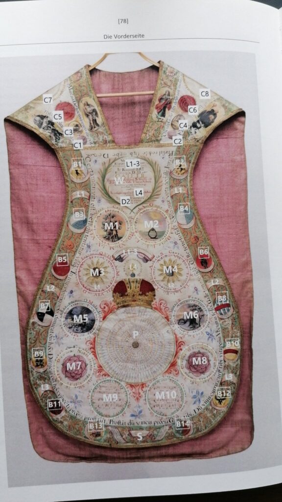 Im innersten Kreis ist der Unterschied besonders deutlich sichtbar. während das gedruckte Vorbild Bezug nimmt auf deutsche Städte wie Bamberg, Heilbronn, Würzburg, Ravensburg, ist das erste Segment des Kaselrades Supremo («dem Höchsten») gewidmet, das nächste dem Papst (Papae) und das dritte Kaiser Leopold (Leopoldo), der als Habsburger von 1658 bis 1705 an der Spitze des Heiligen Römischen Reiches stand. In den Segmenten VII und IX kommt dann auch Spanien-Navarra zum Zuge (Novuarro ac Hispano). Das sind genau jene Mächte, die mit ihren Wappen auch auf der Bordüre vertreten sind.