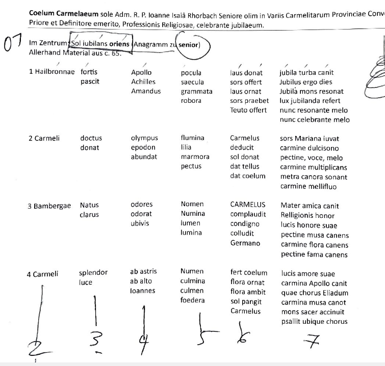 der autor des pdf sagt, dass der innerste satz: sol jubilans “oriens” ein anagramm auf “senior” sei. es sind vermutlich würdigungen an ein geliebten bischof…