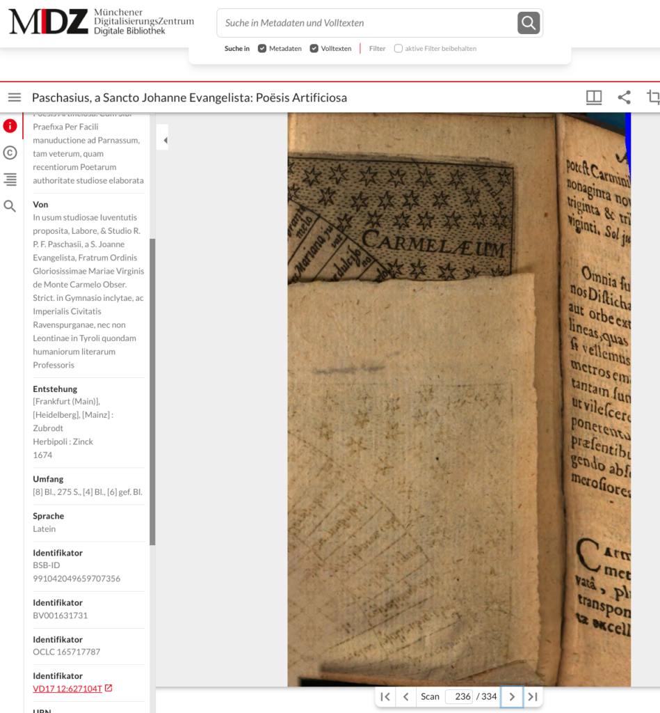 HANS HASELBACH, via eMail: “Übrigens ist Ihnen bei der Präsentation von Paschasius ein Fehler unterlaufen, indem Sie den frühmittelalterlichen Heiligen mit dem Autor der Poësis artificiosa verwechselten, der im 17. Jahrhundert gelebt hat. Aus dem Titelblatt, das Sie abbilden, wird ersichtlich, dass es sich beim Verfasser um einen Karmeliter handelt, also ein Mitglied jenes Ordens, der im 12. Jahrhundert gegründet wurde. Des weiteren heisst es, Paschasius sei an den Gymnasien von Ravensburg bzw. Lienz (im Tirol) als Professor der Alten Sprachen tätig gewesen. Der Rhetoriker hat offenbar beim Eintritt in den Orden bzw. bei seiner Profess den Namen “Ihres” Paschasius gewählt oder bekommen.”