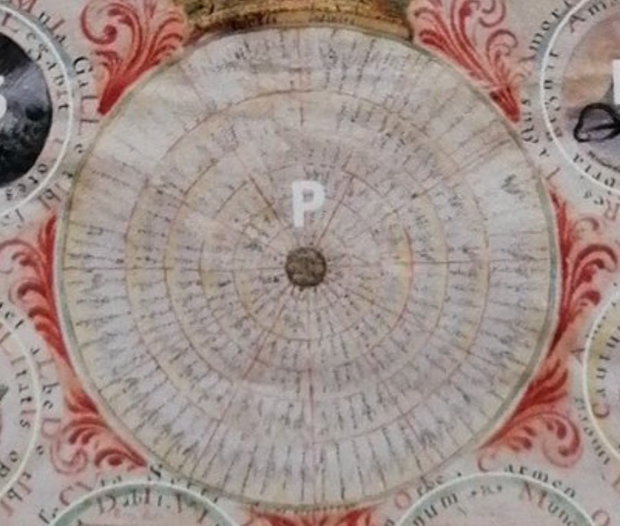 Angenommen, wir beginnen im Zentrum mit “Galle, tuere fidem!” (Gallus, bewahre den Glauben!). Dann könnten wir zum ersten Kreis gehen und “Supremo” auswählen, dann zum zweiten Kreis und “pastor” auswählen, und so weiter. Die ausgewählten Elemente könnten dann zu einem Vers wie “Gallus, bewahre den Glauben! Dem Höchsten ein Hirte…” zusammengesetzt werden.