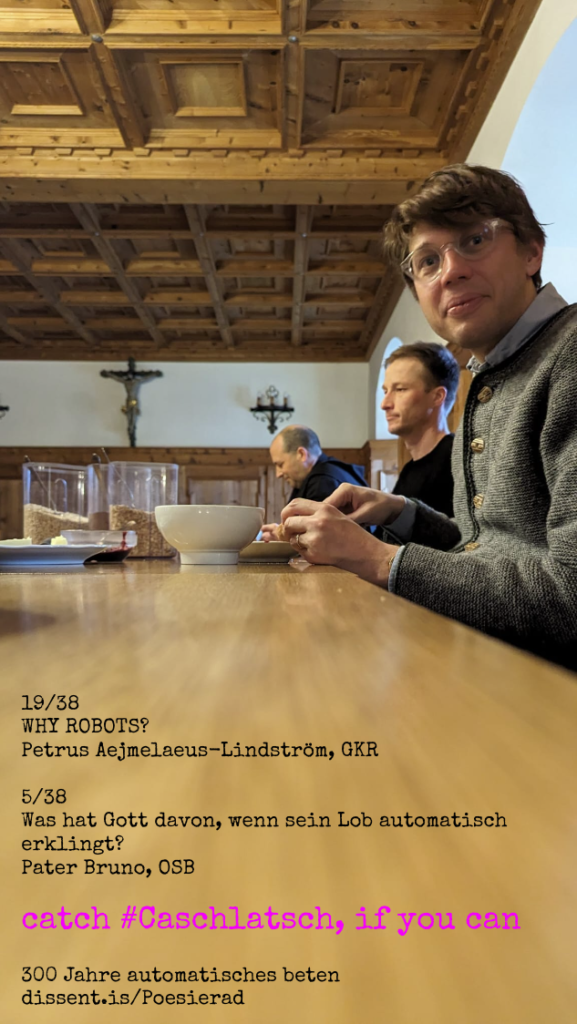 - Das Poesierad erinnert an eine Praxis, die schon vor Jahrhunderten möglich war: Benediktinermönche, die auf liturgischen Gewändern Texte arrangierten – rhythmisch, ornamental, bedeutungsoffen. Diese Praxis war mehr als Schmuck: Sie war ein Modell des Denkens, ein Codieren von Welt in strukturierter Form.