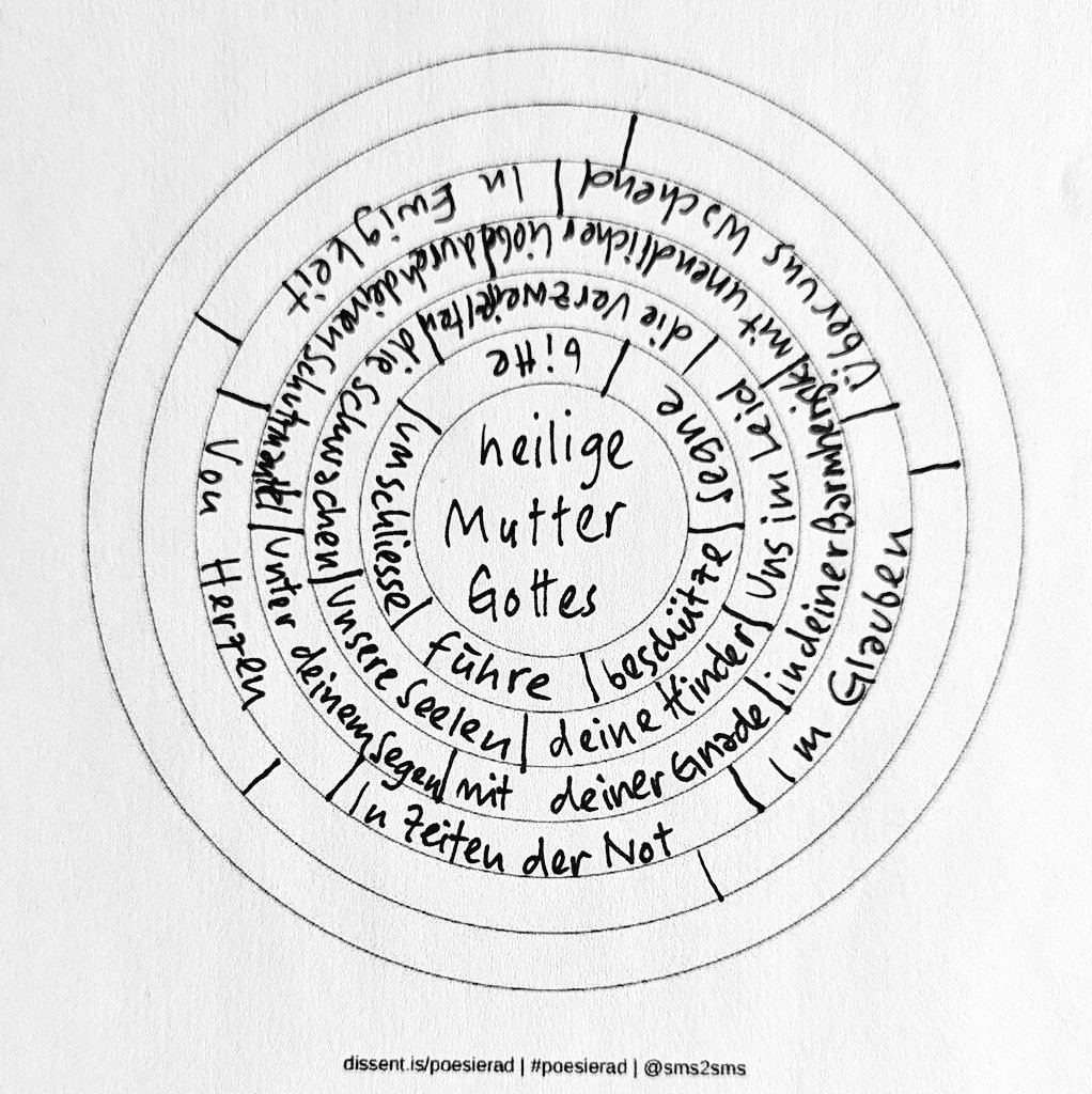 - Interessanterweise kann man das Poesierad auch von außen nach innen lesen. Dann ergeben die Kreise 6 bis 3 den Hexameter, die Kreise 2 und 1 zusammen mit der Mitte den Pentameter.