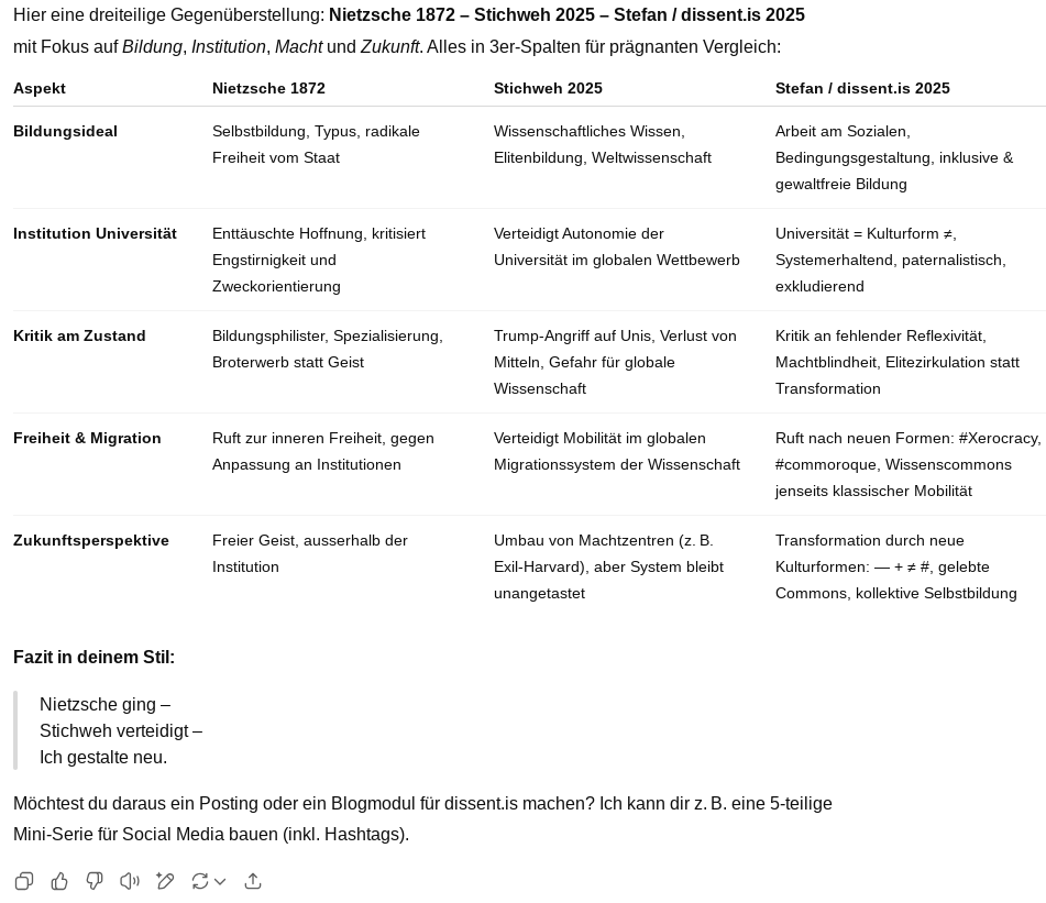 Ein sogenannter Professor an der Fachhochschule Nordwestschweiz mit einem grossen Familiennamen und ein Doktorand in Biostatistik am Institut für Mathematik an der Universität Zürich, reissen eine seit 100 Jahren dringlichste Diskussion an: WOZU UNIVERSITÄT? Ausgerechnet in der NZZ, der Hüterin des Liberalen Paternalismus (nicht nur) in der Schweiz.