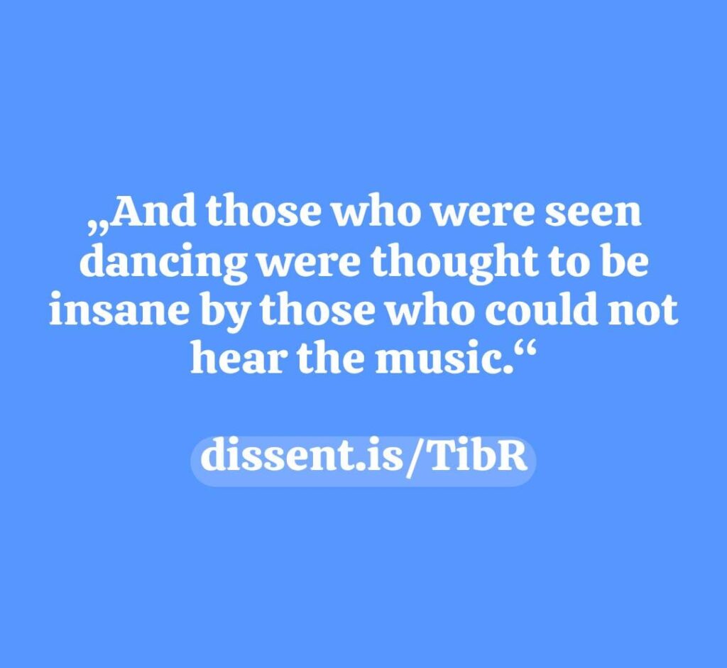 - Manche dokumentieren Sequenzen von ihren Tanz — möglichst den eigenen! nicht jenen der anderen! — und machen diesen im eigenen Blog, auf Social Media etc. mit der Beigabe von Hashtag #TibR offen zugänglich.