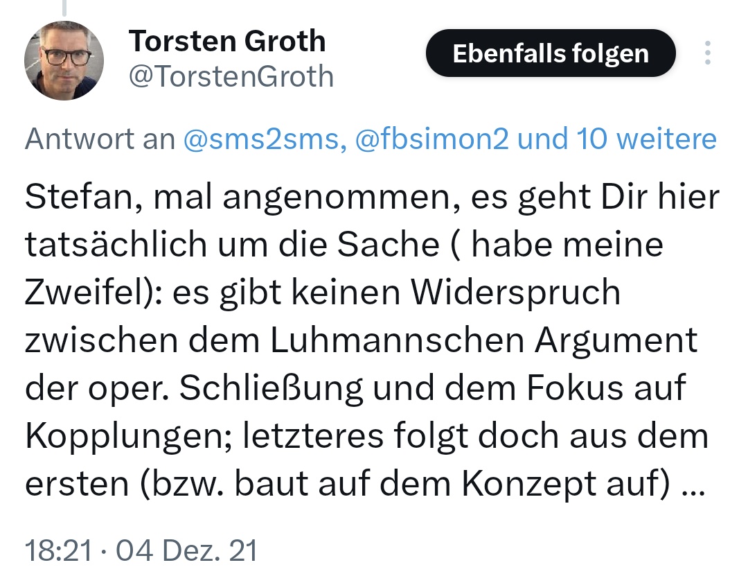 Der Verwaltungsbeamte und Jurist Niklas Luhmann wurde ziemlich überraschend Professor für Soziologie. Nicht für Betriebswirtschaftslehre. Das ist das Problem, welches Torsten erklären müsste. Und wenn sein Werk durchzogen ist von einer Aussage, dann immer und überall wieder, sein offenes Anrennen gegen das, was er abschätzig und durchaus emotional #OrganismusAnalogie schimpfte. Das ist das Problem, was Fritz erklärten müsste.