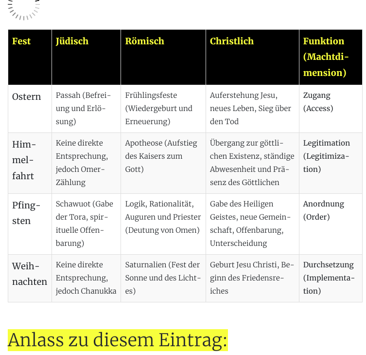 Fest | Jüdisch | Römisch | Christlich | Funktion (Machtdimension) |