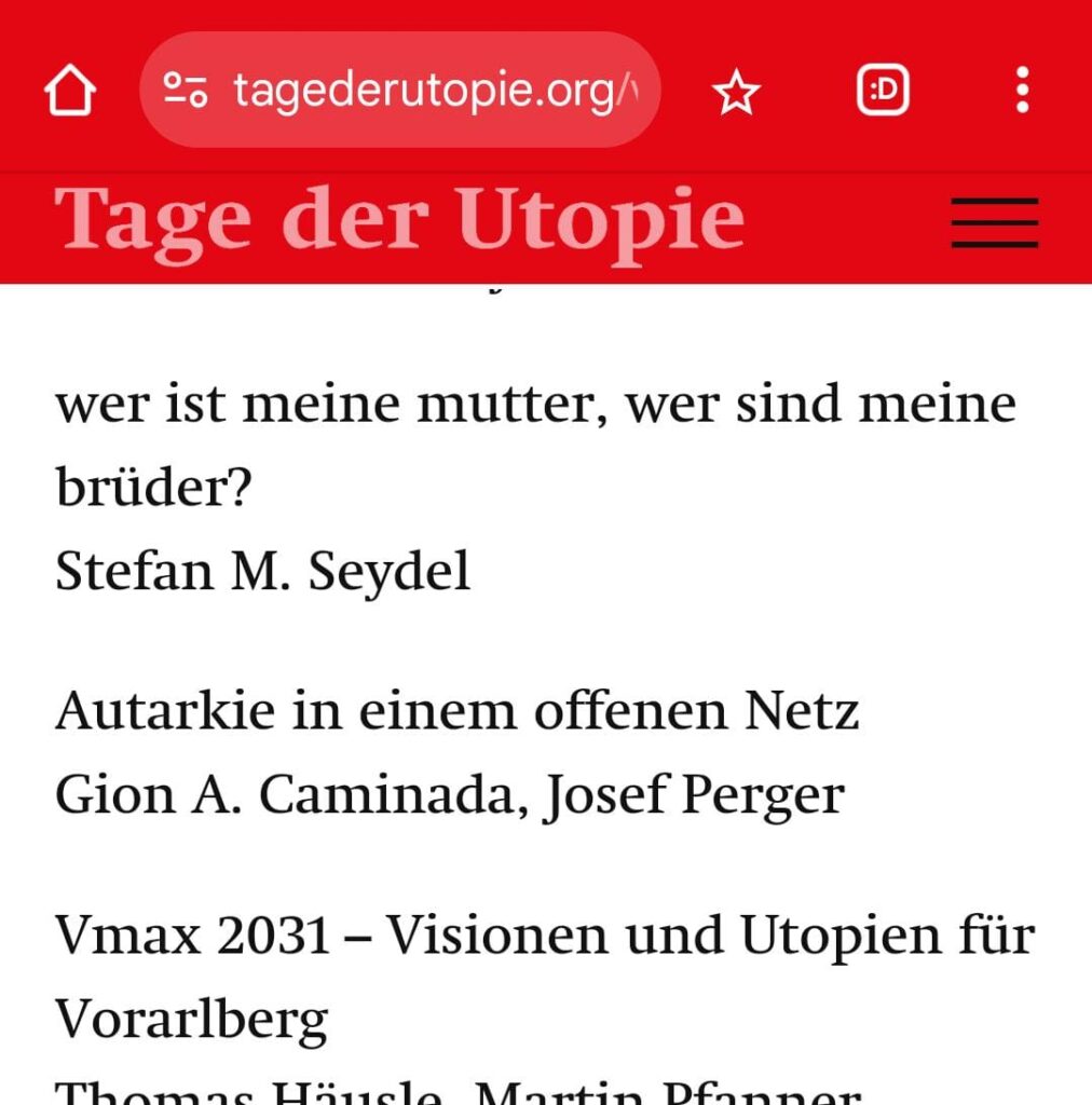 Und Gion A. Caminada machte den Vorschlag, Autarkie im offenen Netz zu denken… Ein Titel, welche freilich ganz wunderbar zum aktuellen AutarkieIndex.org passt… Damals sprachen wir kurz in der Übergabe vom einem Tag zum anderen — er der grosse Professor und ich als ((( rebell.tv ))) achja, dieses weh!weh!weh! was alles zerstört und zermalmt… ufff… — und haben uns erst wieder 2011 neu kennen gelernt, wie ich für das Kloster Disentis 3 Jahre lang in der Schulleitung des Gymnasiums gearbeitet habe, weil ich Architekturführungen durch das Unterhaus angeboten habe… So was wie Besucherschulen (so?)
