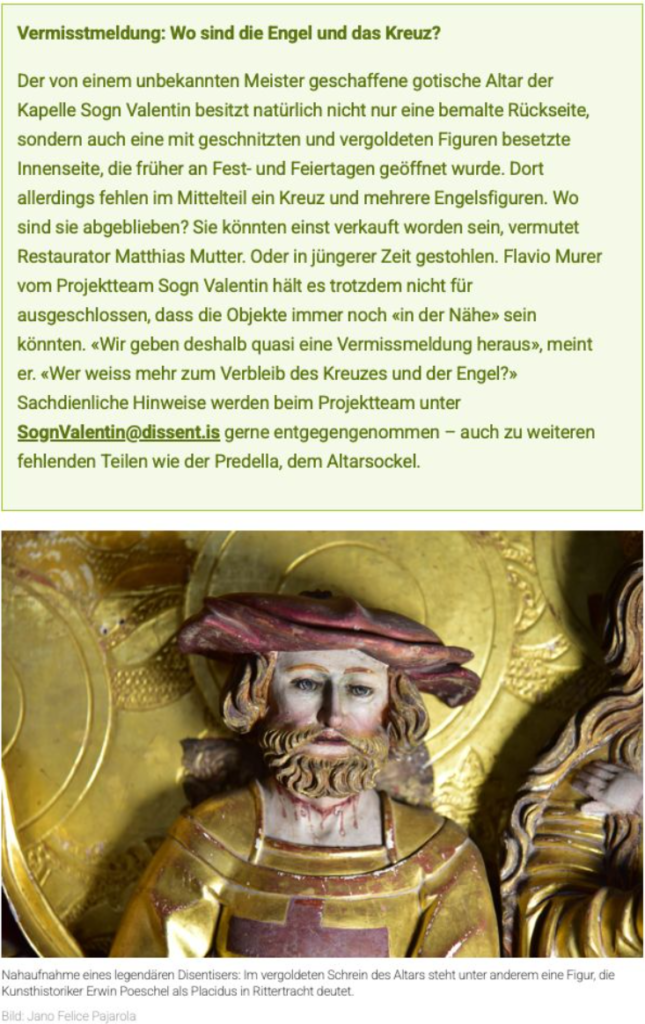 „Für Wanderinnen und Wanderer, die jetzt nach Mumpé Medel kommen, möchten wir ein weiteres kulturelles Angebot schaffen. Die Kapelle Sogn Valentin und dieser wunderschöne Flügelaltar sind eine Attraktion“, sagt Flavio Murer, der sich zusammen mit Tina Piazzi und Stefan M. Seydel für dieses Forschungs- und Informationsprojekt engagiert.