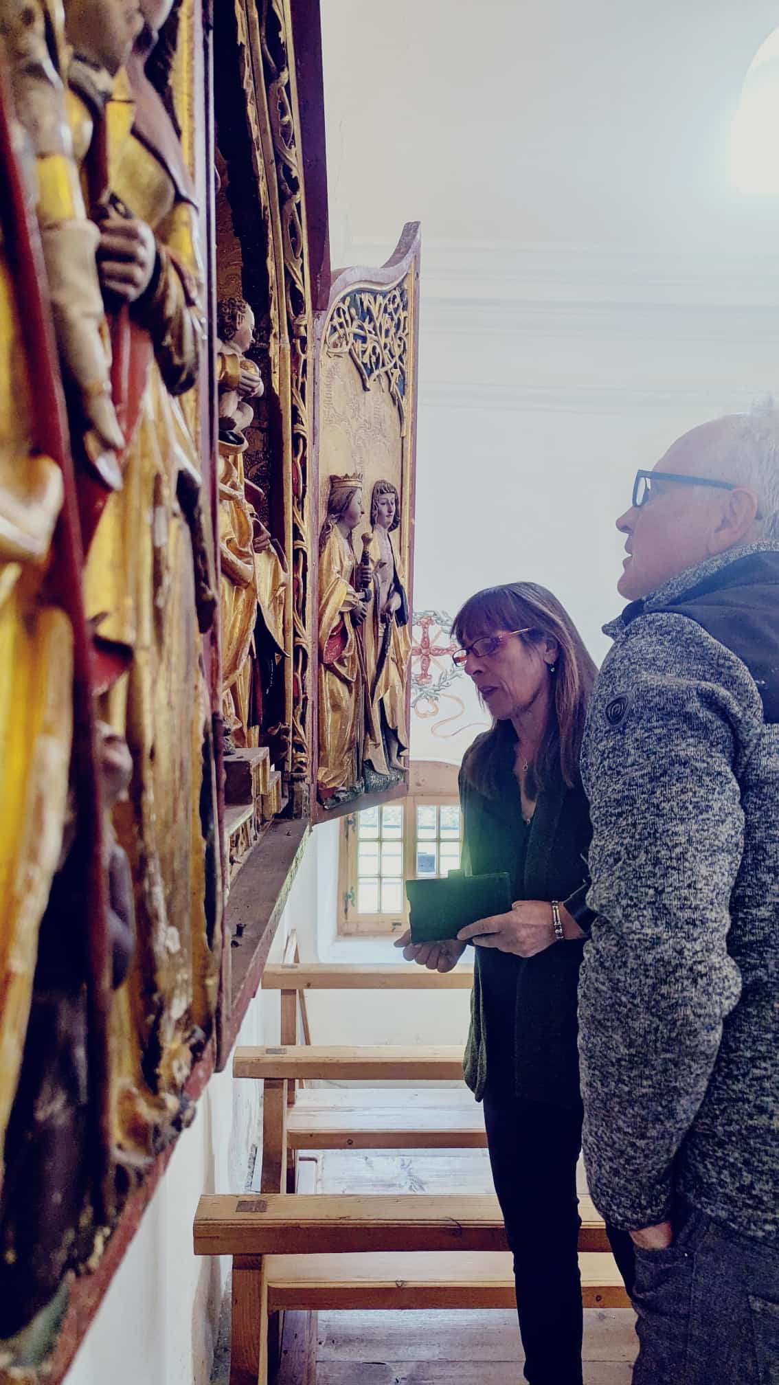 Überraschung, Provokation und Faszination löst zunächst der gotische Flügelaltar von 1515 aus. Seine Figuren zeigen deutlich die Themen des Ortes, aber auch Nähe und Kritik zum Kloster — und damit offen erklärte Eigenständigkeit.