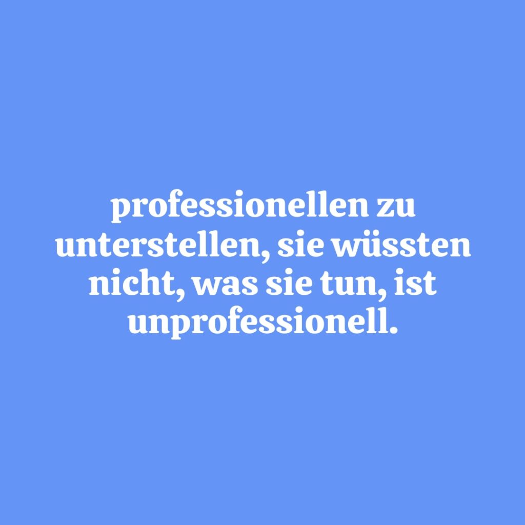 „Professionellen zu unterstellen, sie wüssten nicht, was sie tun, ist unprofessionell.“- Wenn jemand professionell ist, impliziert das: Kompetenz, Wissen, Verantwortung.