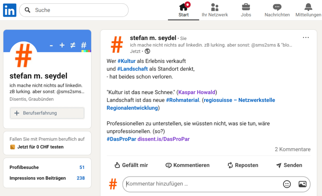 Nach 12 Jahren Berlin und 6 Jahren Zürich zog er aber in seiner zweiten Lebenshälfte vom Bodensee der Rheinquelle entgegen nach Dissentis/Mustér und hat seine Reisetätigkeit fast ganz eingestellt. Dafür macht er umsomehr sogenannte #Feedlogs (Orgiastik). Das sind Arbeitsmeetings an intentionalen Fragen in einem Lifestream. (so?) #TextByChatGPT