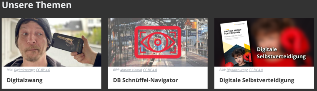 - Strategie: Aufmerksamkeit erzeugen, Bewusstsein schaffen und Menschen in ihren individuellen Handlungen stärken (z. B. digitale Selbstverteidigung, Big Brother Awards).