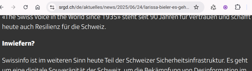 26. Juni 2025: Larissa M. Bieler, Geschäftsleitung SRG SSR gibt im magazin von SRGd zu, was leicht zu beobachten war, aber absolut verboten war auszusprechen: Der Staatsfunkt ist (schon wieder) Teil der Schweizer Sicherheitsinfrastruktur.
