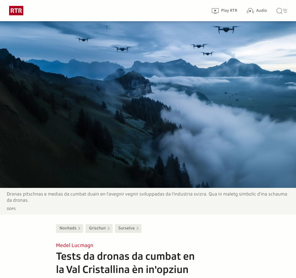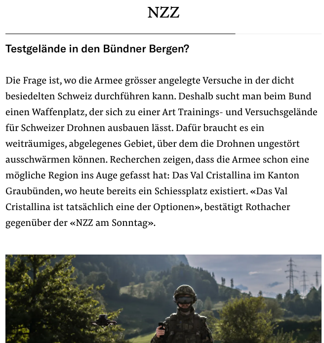 Ein Seitental in unserer Region, welches das Militär schon heute für Kampfeinsätze nutzt, soll neu auch für das Training mit Kampfdrohnen genutzt werden… “Questas dronas duessan en emprima lingia cumbatter objects terresters, ed en segunda lingia objects ord l’aria sco par exempel defender dronas encunter dronas.”