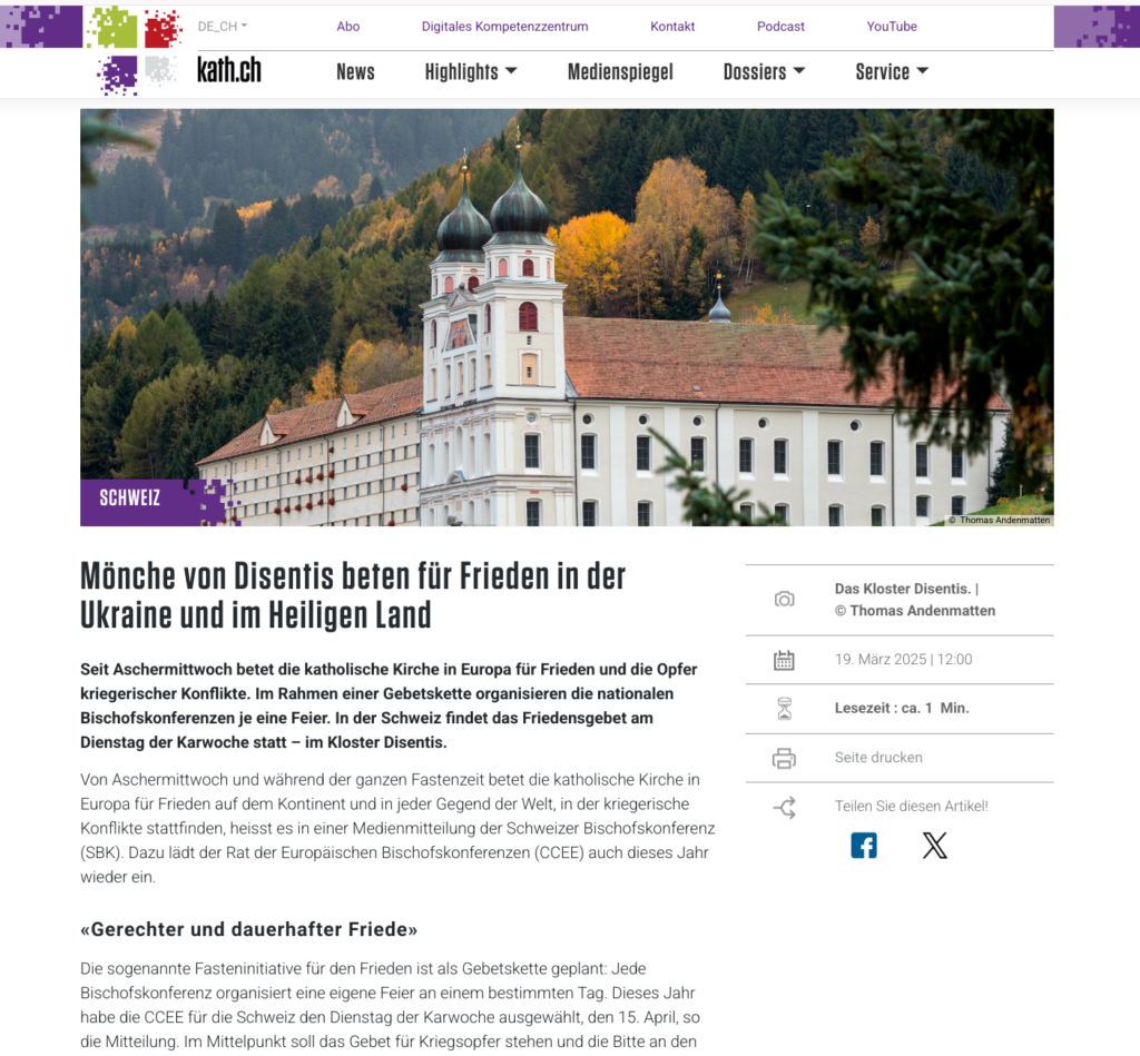 kath.ch | Heute wird im Kloster Disentis für den Frieden gebetet… Frieden in der Ukraine. Frieden im heiligen Land. (Und nicht für den Sudan. Auch nicht für Mynamar…) Stark ist, dass der Text bei kath.ch von “Gerechtem Frieden” und nicht — wie dort sonst üblich! — inbrünstig von “Gerechtem Krieg” geredet wird…