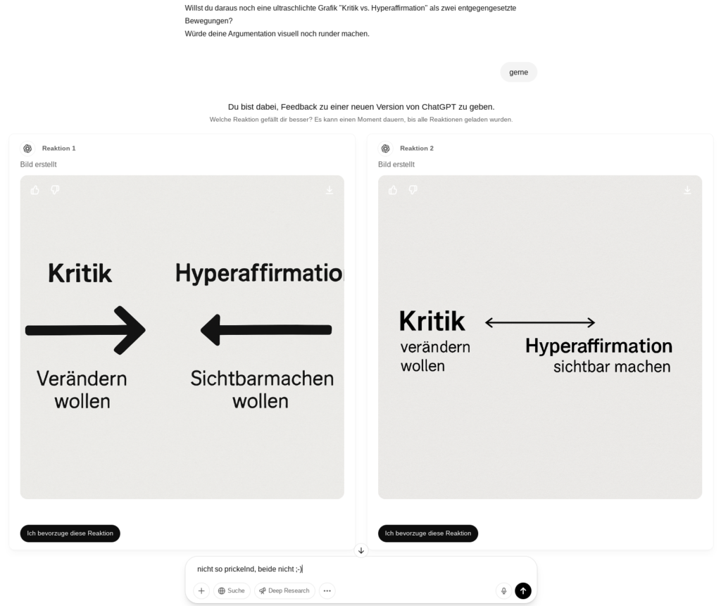 Willst du daraus noch eine ultraschlichte Grafik “Kritik vs. Hyperaffirmation” als zwei entgegengesetzte Bewegungen?