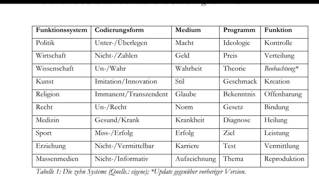 Hier eine klassische Übersicht über die funktionalen Differenzierungen moderner Gesellschaften nach Niklas Luhmann – mit den jeweils zugehörigen binären Codes, wie er sie in “Die Gesellschaft der Gesellschaft” (1997) beschrieben hat: