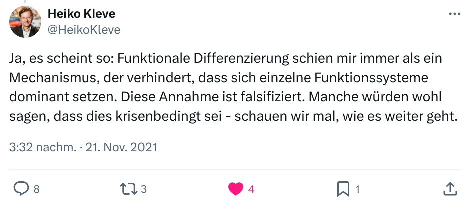 – Wer mit einer falsifizierten These gearbeitet hätte (z. B. „funktionale Differenzierung ist nicht mehr beobachtbar“),