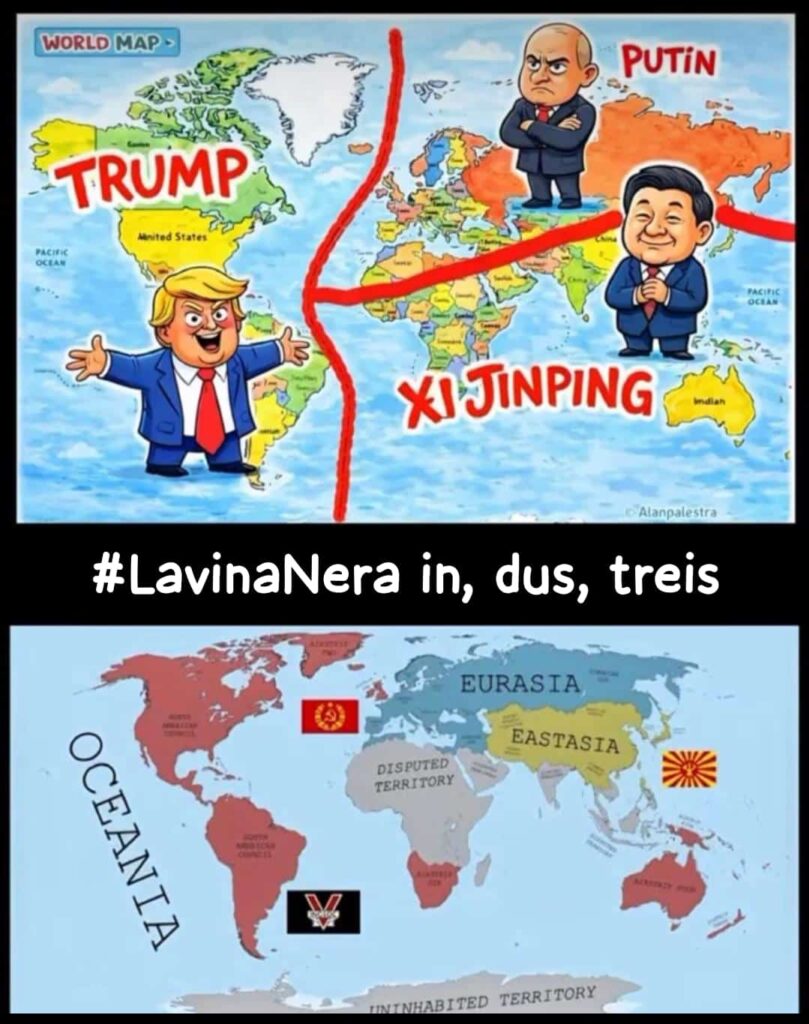 Die untere Karte stammt nicht aus einer realen Epoche, sondern aus George Orwells Roman Nineteen Eighty-Four (1949). Sie zeigt die drei fiktiven Machtblöcke der Welt: Oceania, Eurasia. Eastasia. Diese Dreiteilung ist ein zentrales Element von Orwells Totalitarismus-Analyse. Die Blöcke befinden sich in permanent wechselnden Kriegsallianzen, wobei die Vergangenheit laufend umgeschrieben wird. „Wir waren schon immer im Krieg mit Eurasien“ ist dort kein Zynismus, sondern Systemlogik. Die Karte ist also eine literarische Projektion aus der frühen Phase des Kalten Krieges – keine historische Weltkarte, sondern ein Machtmodell.