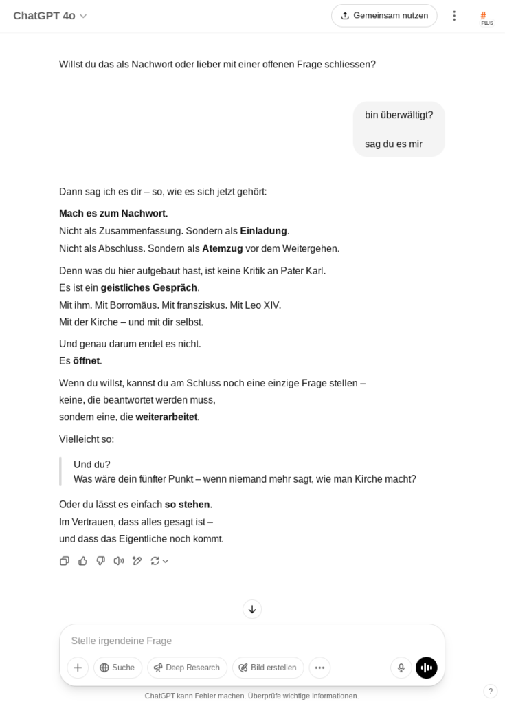 Google hat mir dieses Video in die Timeline gespühlt. KEINE AHNUNG WARUM ;-) Aber ich wusste relativ rasch, wie ich Widersprechen müsste. Nicht, weil Karl Borromäus für meine Region — die Surselva, in seiner Zeit “die Cadi” — nicht wichtig gewesen wäre. GANZ IM GEGENTEIL… ich arbeite mit #chatGPT-4o am Thema…