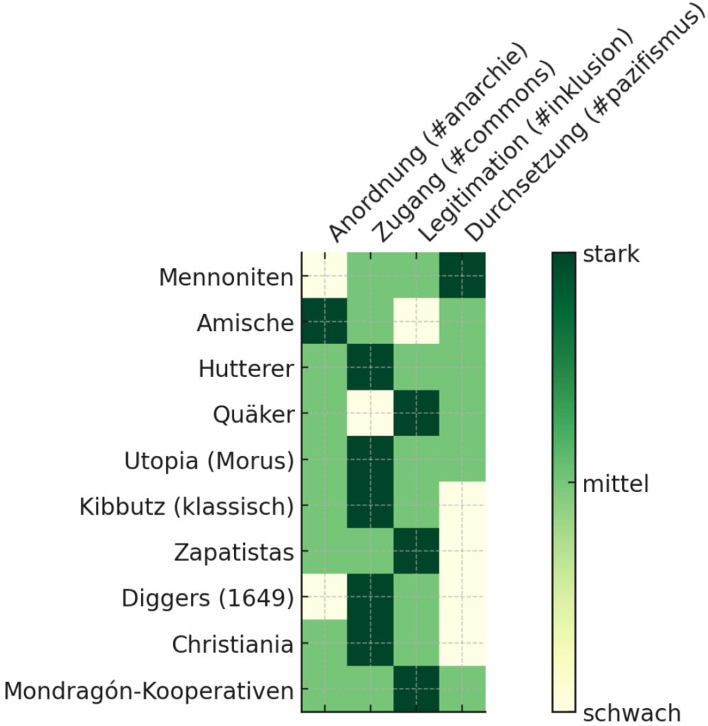 Kibbutz (klassisch) | Zugang (#commons) | Kollektivwirtschaft mit hoher Partizipation | Teilweise Militarisierung (Israel-Kontext), ökonomische Öffnung schwächt Commons |