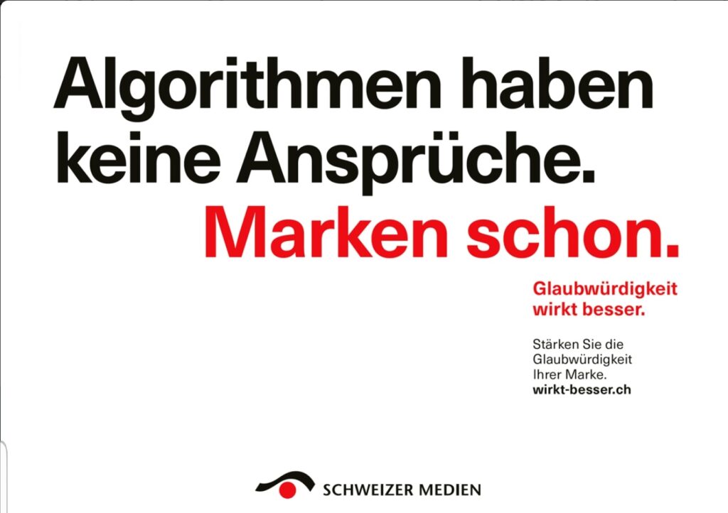 | „Algorithmen haben keine Ansprüche. Marken schon.“ | Algorithmen sind neutral; Marken garantieren Werte & Glaubwürdigkeit. | Algorithmen sind hochgradig zielgerichtet (Engagement, Klicks). Marken manipulieren ebenso (Greenwashing, Dieselgate). Ringier arbeitet selbst mit Palantir-Algorithmen. |