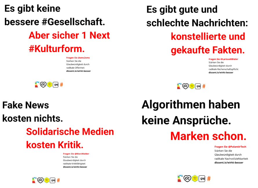 | „Fake News kosten nichts. Aber wir alle bezahlen den Preis.“ | Fake News entstehen gratis, die ganze Gesellschaft leidet. | Fake News werden gezielt finanziert (Trollfabriken, PR). Leitmedien verbreiten selbst falsche Informationen. „Wir alle“ ist rhetorisch unklar – Medienhäuser verursachen Vertrauensverlust selbst (#WalderGate). |