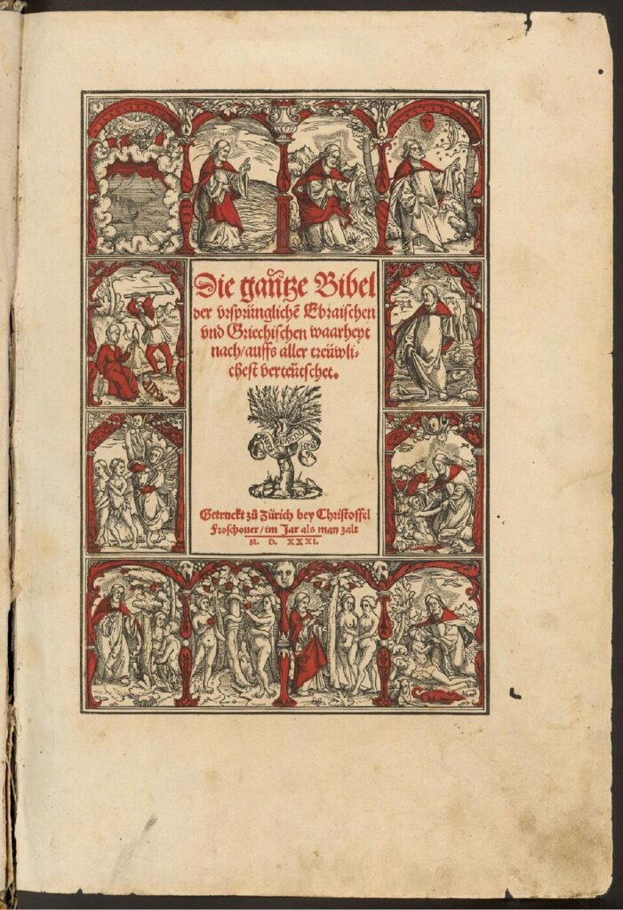 The two-volume splendid edition in Folio bears the title: Die gantze Bibel der vrsprünglichē Ebraischen und Griechischen waarheyt nach/ auffs aller treüwlichest verteütschet. It is richly illustrated, partly with woodcuts after drawings by Hans Holbein the Younger. A preface, probably written by Leo Jud, shows strong influence from Erasmus of Rotterdam. Elaborate additions such as a keyword index, summaries (chapter summaries), glosses and parallel passages make the text accessible. (wikipedia)