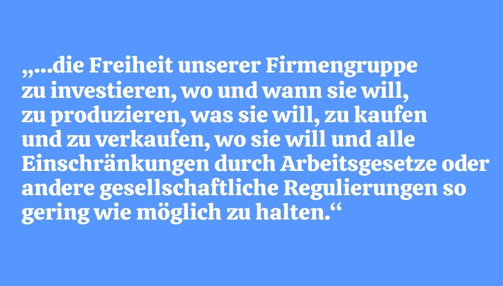 „…die Freiheit unserer Firmengruppe zu investieren, wo und wann sie will, zu produzieren, was sie will, zu kaufen und zu verkaufen, wo sie will und alle Einschränkungen durch Arbeitsgesetze oder andere gesellschaftliche Regulierungen so gering wie möglich zu halten.“