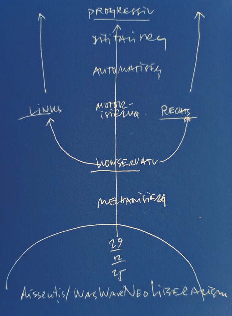 Der neoliberale Moment lässt sich als doppelte Bewegung lesen. Vertikal als technischer Fortschritt von Mechanisierung über Motorisierung und Automatisierung bis zur Digitalisierung. Horizontal als politisches Pendel zwischen links und rechts, das sich auf einem konservativen Sockel stabilisiert, sich aber selbst als progressiv versteht. Der Eindruck von Fortschritt entsteht nach oben, während unten Kontinuitäten bestehen bleiben.
