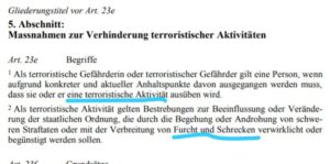 “Mit dem neuen Bundesgesetz über Polizeiliche Massnahmen zur Bekämpfung von Terrorismus (PMT) sollen die präventiven Kompetenzen des Bundesamtes für Polizei massiv ausgebaut werden. Die im Gesetzentwurf enthaltenen Begriffe und polizeilichen Handlungsspielräume gefährden die Grund- und Menschenrechte der Schweizer Bevölkerung.” verharmlost humanrights.ch (so?)
