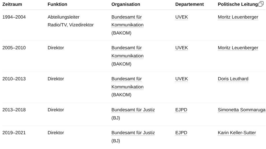 - Bekannte Ämter: Direktor BAKOM (2005–2013), Direktor BJ (2013–2021)