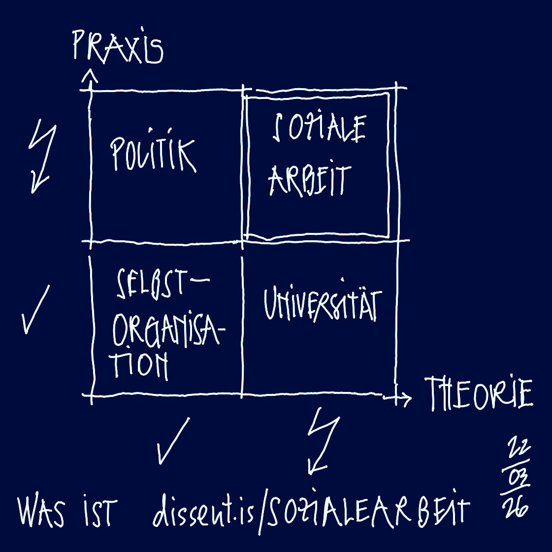 Soziale Arbeit ist in diesem Bild nicht einfach ein weiteres Feld neben den anderen. Sie ist Arbeit am Sozialen. (Nicht an Körpern. Nicht an Psychen. Nicht an Dingen.) Das heisst: Sie arbeitet an den Bedingungen, unter denen Menschen überhaupt in tragfähigen Austausch kommen können. Sie steht im Schnittpunkt von Selbstorganisation, Politik und Universität, aber sie geht in keinem dieser Felder auf.