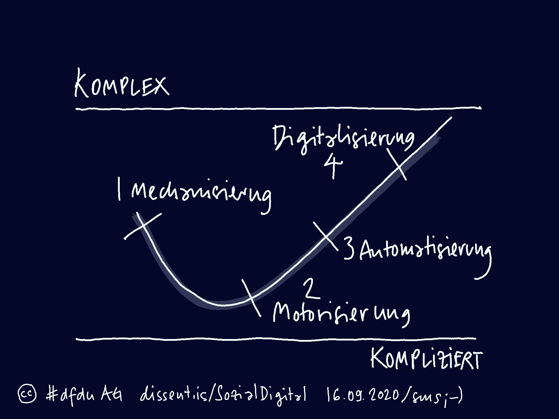 Kurzum: Mir scheint es attraktiv zu sein, den Begriff “Digitale Soziale Arbeit” zu skandalisieren, weil damit sehr einfach, auf die Ziele von Sozialer Arbeit verwiesen werden kann und um den Abstand zu aktueller Praxis zu vermessen. Darum werde ich zum Schluss dieses Inputs einen Vorschlag machen, wie wir mit dem Begriff “Digitalisierung” so umgehen können, dass für Suchbewegungen und die “Arbeit am Sozialen” wiederum ein angemessener Raum verspunden ist.