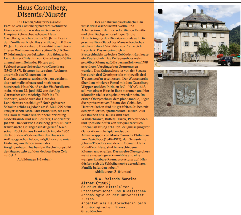 - Rutishauser Hans, Disentis Haus Hess, ehemals Castelberg (Nr. 45), Kurzbeschrieb und Würdigung der Kantonalen Denkmalpflege, Archiv Denkmalpflege Graubünden, Chur 2005, S. 1–3.