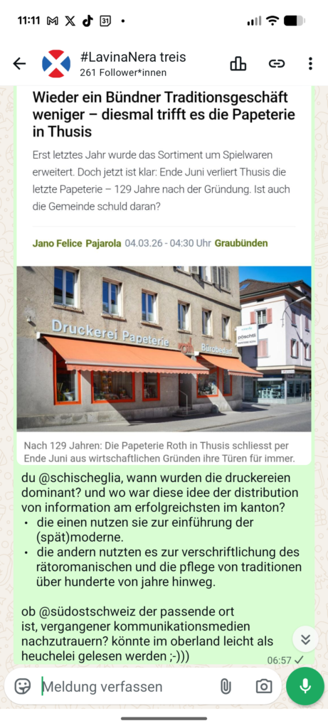 - Der Präsident der Fraktiun Vitg (Livio Zanetti): Es gibt viele offene Fragen was das Zentrum betrifft: Er klärt ab, wir sammeln Fragen (Via Cons, TukTuk, Via Cavardiras…)