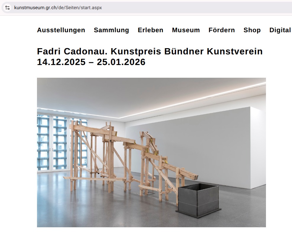 2025 geht der Preis an Fadri Cadonau, einen jungen Künstler aus der Surselva. Er arbeitet präzise, ruhig und mit grosser formaler Klarheit. In seiner Installation steht Wasser im Zentrum. Es fliesst durch eine Holzkonstruktion, tropft in einen dunklen Behälter, wird von Geräuschen begleitet und taucht den Raum in eine fast meditative Stimmung.