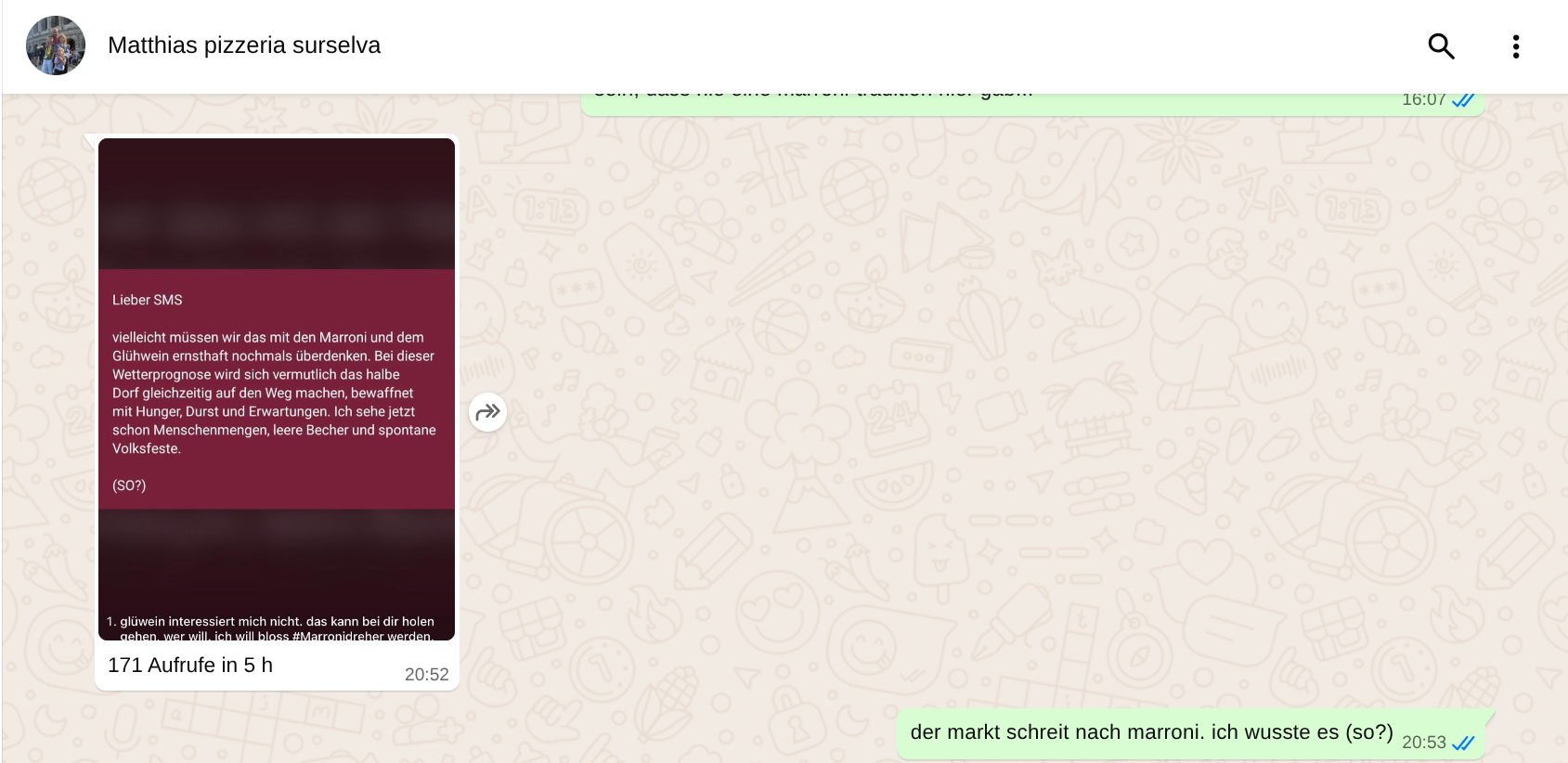 Jetzt bin ich 60 Jahre alt geworden. Und lebe seit bald 15 Jahren in der gleichen Alpenregion wie Davos. Dort fühlt sich die globale Elite sicher und so heimelig wie zu Hause. Ich lebe ein Tal weiter, in der Surselva. Das Tal der Rheinquelle am Scheidepunkt zwischen zwei Alpenpässen hört seit Jahrhunderten auf das Rauschen der Welt — RERUM NOVARUM — und antwortet immer wieder mit einem ganz eigenen, eigensinnigen Weg. Ein Weg, den wir bis heute mit #LavinaNera in, dus, treis durchnummerieren…